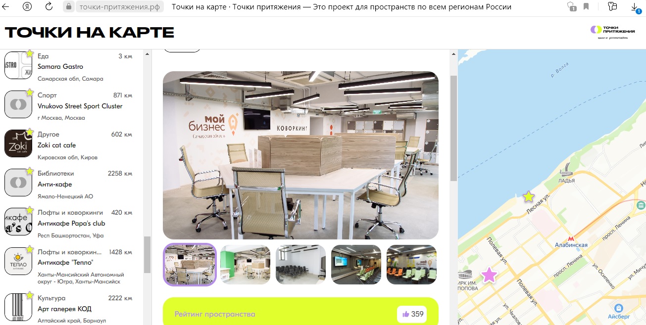 В список главных точек притяжения молодежи в Самарской области, помимо центра «Мой бизнес», попали: центр молодежных инициатив «StrelkaHall», NAMES коворкинг для предпринимателей, муниципальное бюджетное учреждение г.о. Тольятти многофункциональный молодежный центр «Шанс», Samara Gastro, МБУ ДМО «Альянс молодых» г.о. Кинель, тайм-кафе Plastilin.