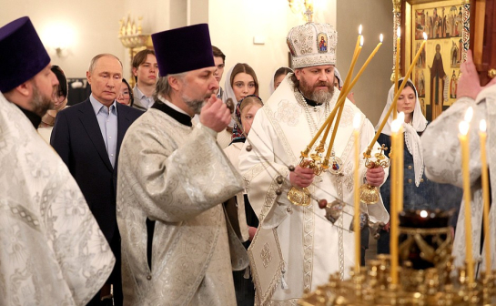 В Рождественскую ночь президент Владимир Путин посетил богослужение в храме Спаса Нерукотворного Образа в Ново-Огареве, которое провел архиепископ Фома. Вместе с главой государства на службу пришли семьи военнослужащих, погибших в зоне СВО. Накануне, в сочельник, президент встретился с ними в подмосковной резиденции.