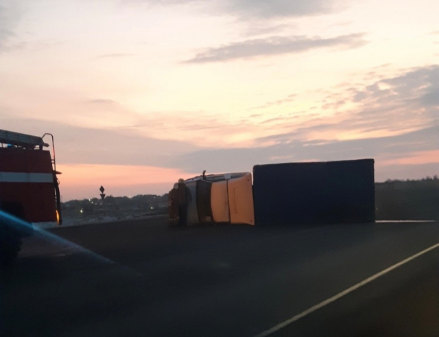 Видно, что грузовик завалился на бок прямо на проезжей части и получил повреждения. На месте работал пожарный расчет и другие экстренные службы. Информация об обстоятельствах аварии и о пострадавших уточняется.