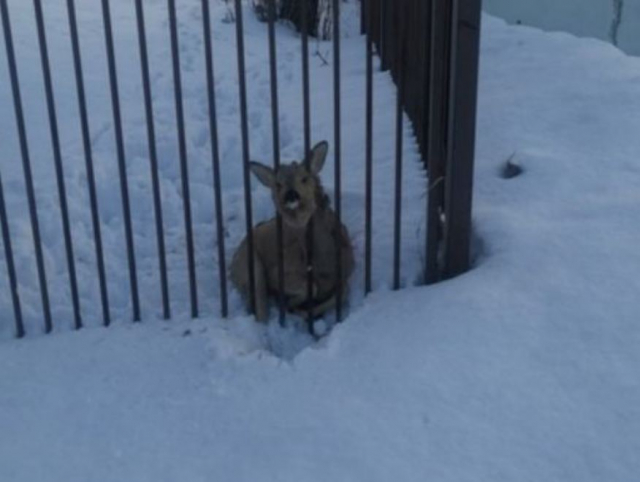 В неприятность попала косуля, которая пыталась пробраться к одной из школ Новокуйбышевска. По словам очевидцев, к образовательному учреждению она прибежала со стороны местного кладбища. Непреодолимым препятствием для нее стал забор, в котором застряла голова животного.
