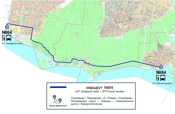Автобус будет работать по принципу экспресса и проследует по схеме: Спортивная – Приморский – Степана Разина – Спортивная – Лесопарковое шоссе – Комзина – Комсомольское шоссе – Коммунистическая.