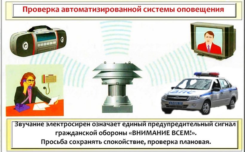 В 10.40 будут включены на 3 минуты городские электросирены с последующей передачей по радиовещанию и телевидению речевого сообщения: «ВНИМАНИЕ ВСЕМ! ПРОВОДИТСЯ ТЕХНИЧЕСКАЯ ПРОВЕРКА ГОТОВНОСТИ СИСТЕМЫ ОПОВЕЩЕНИЯ НАСЕЛЕНИЯ!»