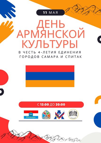 11 мая 2023 года с 12:00 в Библиотеке народов Поволжья (ул. Ленинградская, 7) пройдет День армянской культуры. При поддержке Администрации Самары мероприятие в честь 4-летия единения городов Самары и Спитака проводят Самарская региональная общественная организация "Армянская Община" и муниципальное бюджетное учреждение культуры г. о. Самара «Централизованная система детских библиотек».