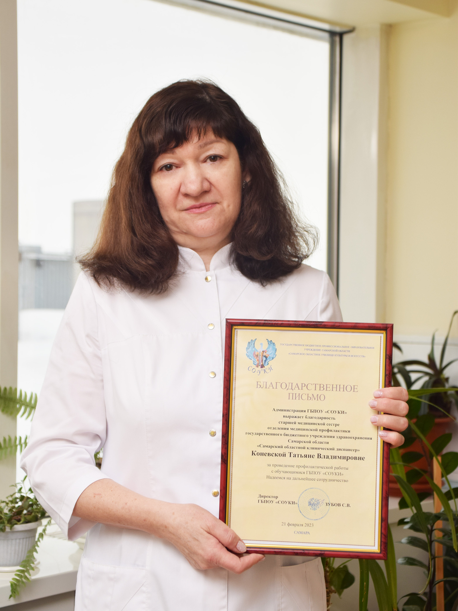 21 февраля 2023 года за активную профилактическую работу с учащимися ГБПОУ «Самарское областное училище культуры и искусств» благодарственным письмом от администрации была награждена старшая медицинская сестра отделения медицинской профилактики ГБУЗ СОКОД Татьяна Владимировна Коневская. Поздравляем Татьяну Владимировну с заслуженной благодарностью и желаем и дальше продолжать эту важную и ответственную работу!