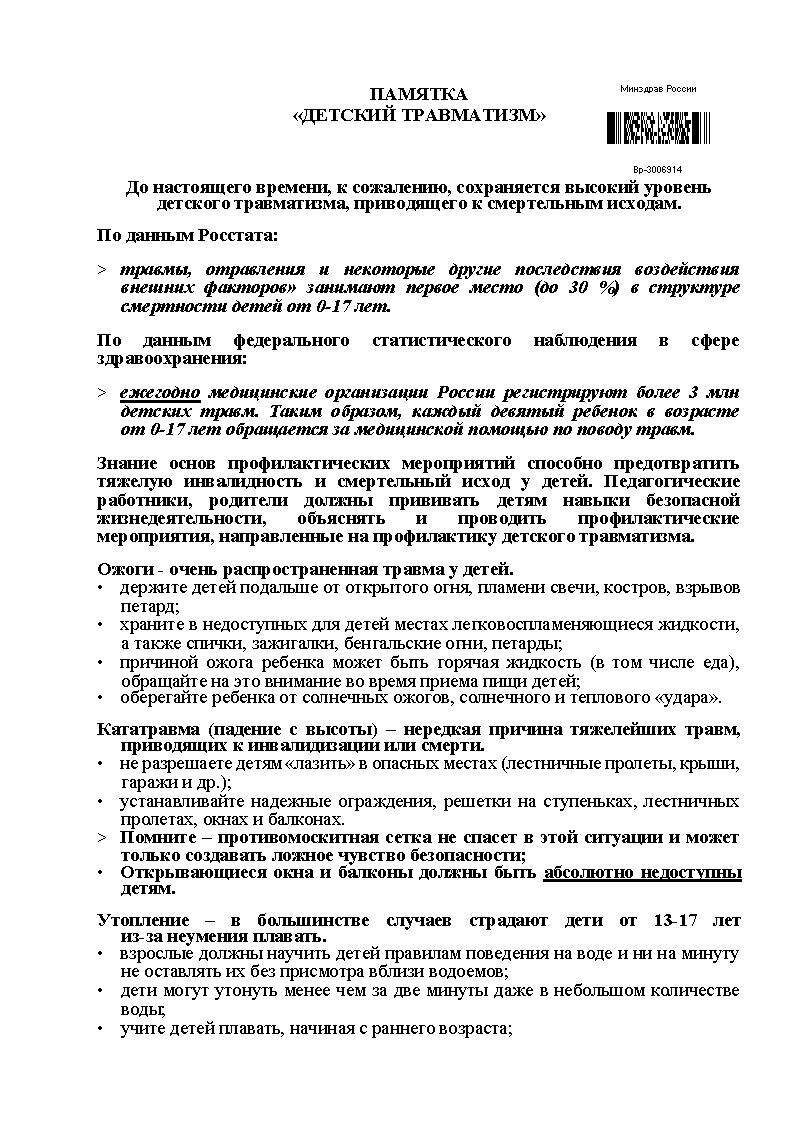 В настоящей памятке представлены основные принципы профилактики травматизма у детей школьного возраста в различных ситуациях