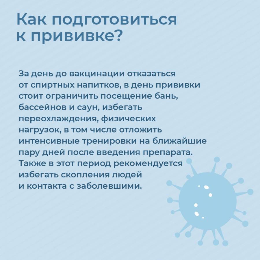 За день до вакцинации желательно отказаться от спиртных напитков, в день прививки стоит ограничить посещение бань, бассейнов и саун, избегать переохлаждения, физических нагрузок, в том числе отложить интенсивные тренировки на ближайшие пару дней после введения препарата.