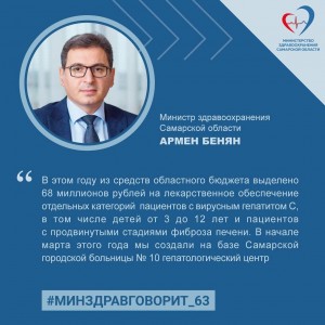 «В этом году из средств областного бюджета выделено 68 миллионов рублей на лекарственное обеспечение отдельных категорий пациентов с вирусным гепатитом С, в том числе детей от 3 до 12 лет и пациентов с продвинутыми стадиями фиброза печени. В начале марта этого года мы создали на базе Самарской городской больницы № 10 гепатологический центр. Он будет курировать оказание помощи всем пациентам с этим заболеванием. Второй год на базе поликлиники № 3 Тольятти работает подразделение по отпуску препаратов. В этом году также откроем подобное подразделение в Сызранской городской и районной больнице», - рассказал министр здравоохранения Самарской области Армен Бенян.