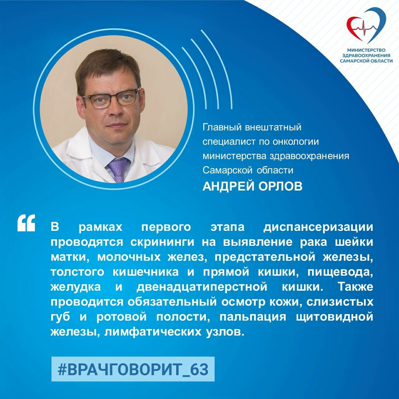 В рамках первого этапа диспансеризации проводятся скрининги на выявление рака: шейки матки, молочных желез, предстательной железы, толстого кишечника и прямой кишки, пищевода, желудка и двенадцатиперстной кишки. Также проводится обязательный осмотр кожи, слизистых губ и ротовой полости, пальпация щитовидной железы, лимфатических узлов.