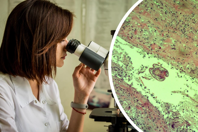 Неожиданный паразитУвидеть в микроскоп врачи могут не только опухоли, но и вещи поэкзотичнее. Например, паразитов. На фото с микроскопа ниже — эхинококкоз.