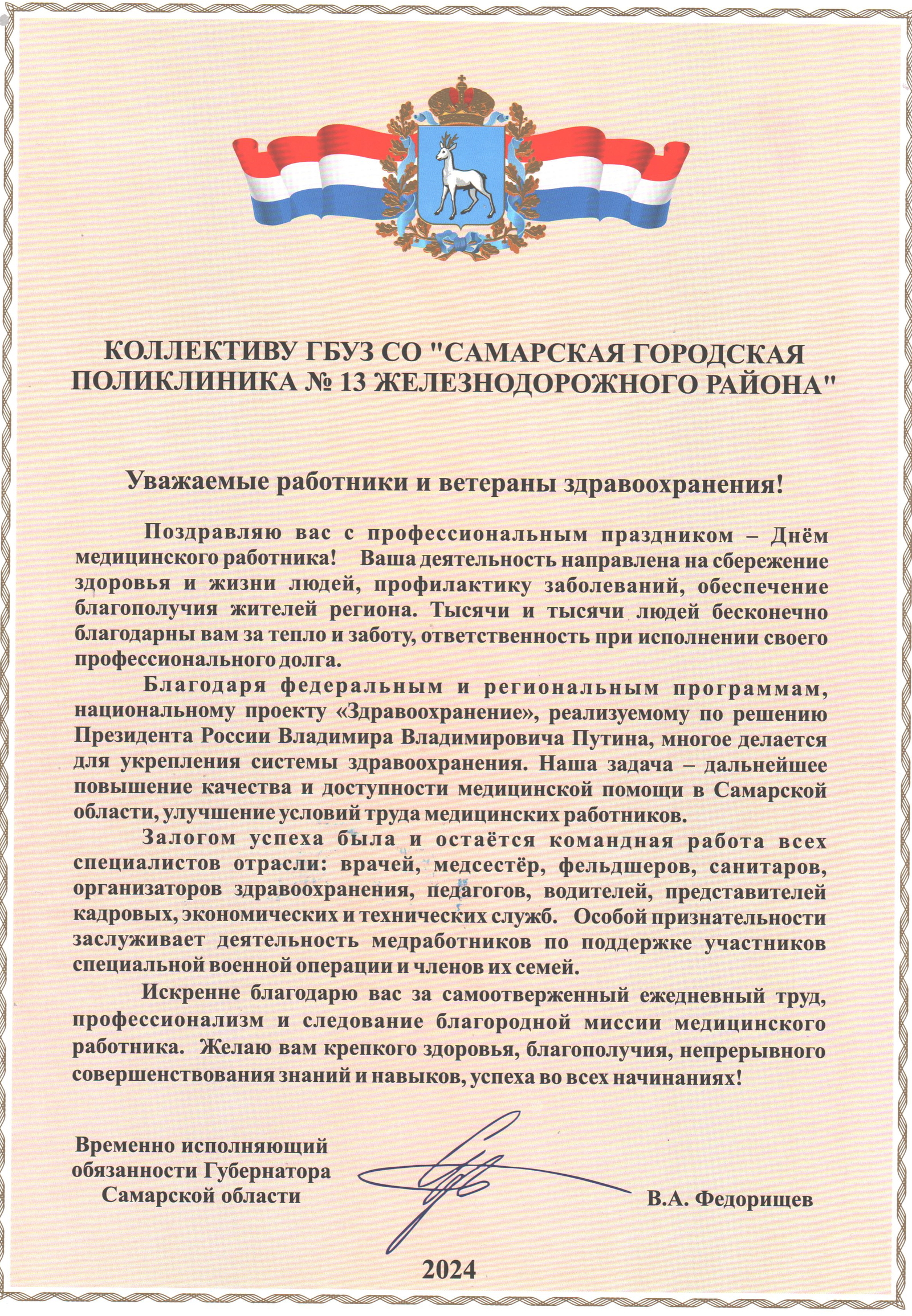 Глава региона поздравил медиков области 13.06.2024 с профессиональным праздником. Вячеслав Федорищев также отметил, что очень много делается в сфере здравоохранения благодаря нацпроекту, реализуемому по решению Президента Российской Федерации Владимира Путина, а также другим региональным и федеральным программам.