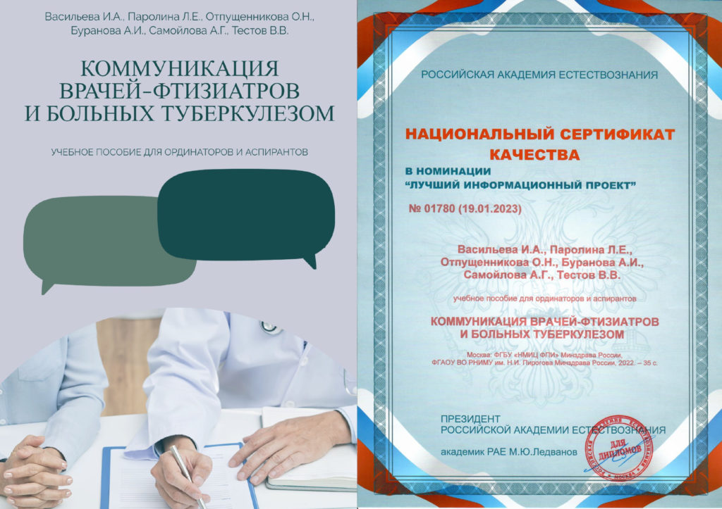 Практическое руководство «Коммуникация врачей-фтизиатров и больных туберкулезом» коллектива авторов НМИЦ ФПИ Минздрава России (Васильева И.А., Паролина Л.Е., Отпущенникова О.Н., Буранова А.И., Самойлова А.Г., Тестов В.В.) получило Национальный сертификат качества Академии естествознания в номинации «Лучший информационный проект» и отобрано для представления на уникальной выставочной платформе дистанционной XLVIII международной выставки-презентации научных, технических, учебно-методических и литературно-художественных изданий, которая проводится в рамках дистанционных проектов РАЕ.