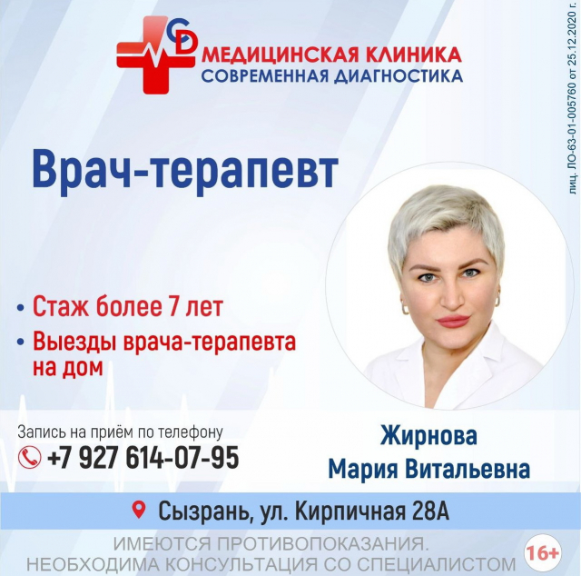 В Сызрани ведет ежедневный прием Мария Жирнова - опытный врач-терапевт со стажем работы более семи лет. Задачи широкопрофильного специалиста с высшим медицинским образованием - диагностика, лечение и профилактика заболеваний практически всех органов и систем.