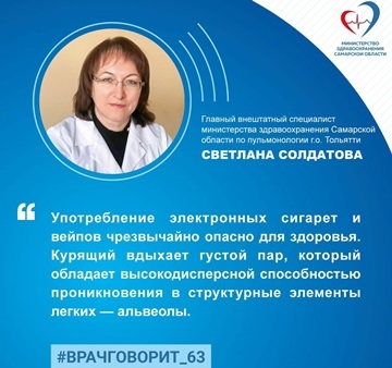 Главный внештатный специалист министерства здравоохранения Самарской области по пульмонологии г.о. Тольятти, заместитель главного врача по медицинской части Тольяттинской городской клинической поликлиники №3 Светлана Солдатова :