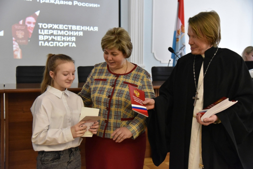 Вручала паспорта юным землякам глава Сызранского района Виктория Кузнецова. Вместе с почетными гостями - заместителем начальника отдела по вопросам миграции МУ МВД России «Сызранское», подполковником полиции Дмитрием Хрипуновым и настоятелем Храма Сергия Радонежского, протоиереем, членом общественного совета отцом Александром - глава муниципального района поприветствовала ребят и их родителей.