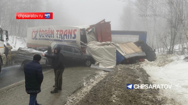 Массовую аварию на федеральной автодороге Сызрань-Саратов спровоцировал занос прицепа грузовика в условиях тумана.