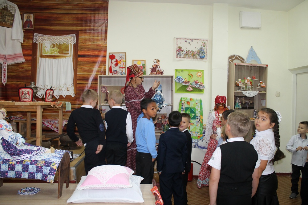 Так, Елена Ракова познакомила собравшихся с экспозицией «Незабытые ремесла», где можно было увидеть не только старые утюг и прялку, но и наряды народов Поволжья, узнать, как они создавались и в чем было их предназначение. Мария Алпеева рассказала любопытную историю о мистическом обереге «Око Божье», который защищает от сглаза и порчи бабы-яги, Лешего, Кикиморы и, конечно, от двоек в дневнике. Анна Токмасова провела гостей встречи по волшебному терему, в который можно «поселить» свою семью или друзей, но для начала их нужно было нарисовать, а затем с помощью клеевого стика поместить в «дом».