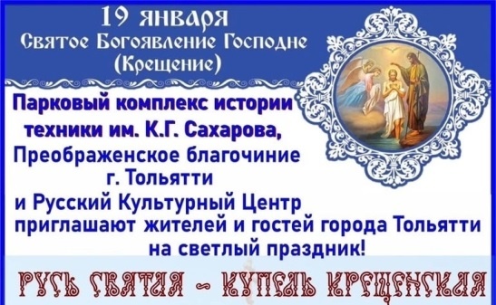 В ближайшую пятницу, 19 января, верующие христиане отмечают Крещение Господне. В Тольятти Парковый комплекс истории техники им. К.Г. Сахарова при содействии Преображенского благочиния и Русского Культурного Центра в честь светлого праздника организует молебен с освящением воды и купание в проруби.