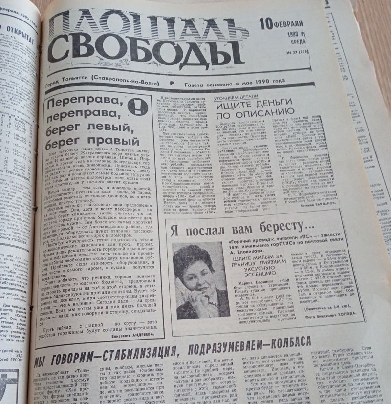 Пролистываем несколько февральских номеров за 1993 год. На первой странице номера за 6 февраля заметка «Ваучер в тумане», в которой корреспондент рассказывает, что 14 тысяч тольяттинцев до сих пор не получили свой ваучер – документ на который россиянам предлагалось получить свою долю государственной собственности развалившегося СССР. Интересно, много ли нашлось соотечественников, которые с толком и прибылью для себя и своей семьи смогли пристроить эту ценную бумагу? Или большинство отнесли их в финансовые пирамиды, которые через очень короткий срок полопались, словно мыльные пузыри?