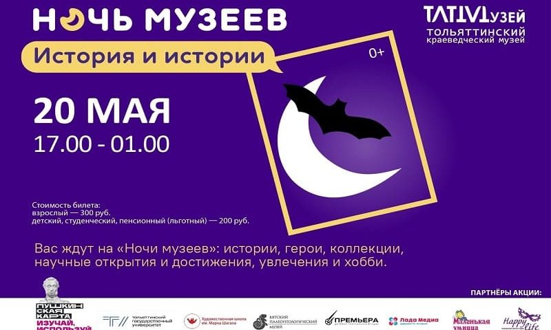 Тольяттинский краеведческий музей присоединяется к всероссийской акции «Ночь музеев». Тема этого года — «История и истории». В центре внимания — истории, герои, коллекции, научные открытия и достижения, увлечения и хобби. Все это будет представлено на разных площадках в музее с 17.00 до 1.00. Программа рассчитана на семейных посетителей с детьми, молодежь, взрослых — для каждой из этих аудиторий мы постарались сделать что-то интересное и познавательное — от маршрутных «бродилок» с заданиями, игр и мастер-классов до театрализованных постановок и лекций.