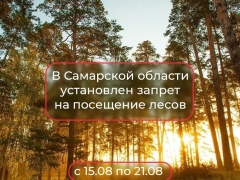 На территории Самарской области, в связи с высокой пожарной опасностью в лесах, с 15 по 21 августа включительно установлен запрет на пребывание граждан в лесах и въезд в них транспортных средств, на территории всех лесничеств Самарской области.