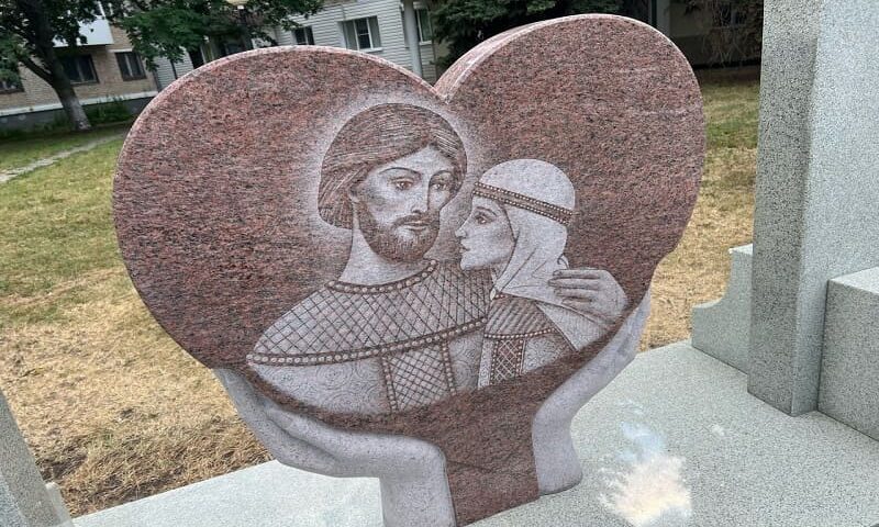 На территории ЗАГСа Центрального района установили мемориал — стелу в форме сердца с портретом святых Петра и Февронии Муромских.