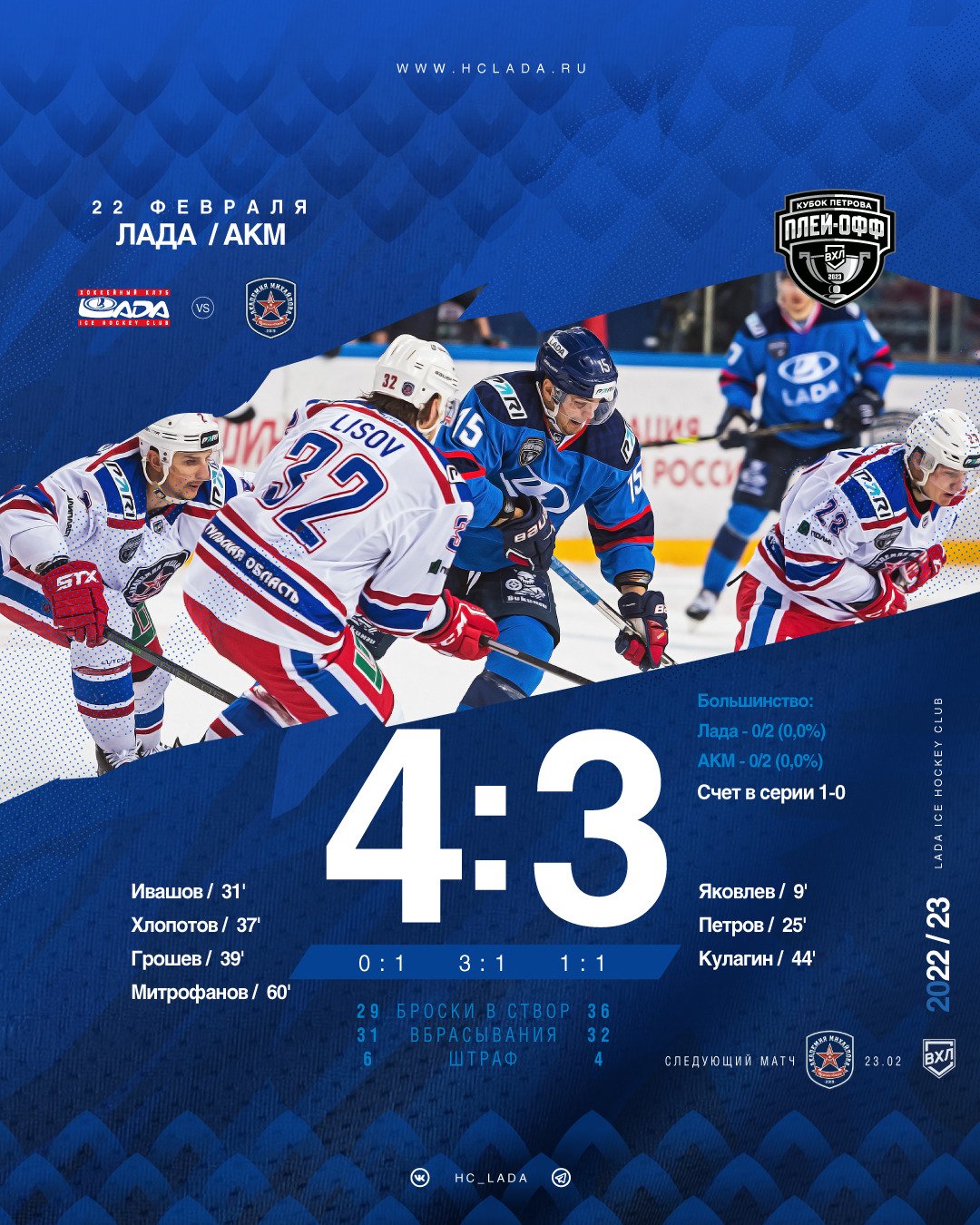 22 февраля. «Лада» - «АКМ» (Тульская область) – 4:3 (0:1, 3:1, 1:1)